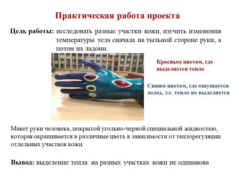 На основании практической работы смоделирован макет руки человека, который покрыт специальной жидкостью, под ее действием рука человека окрашивается в различные цвета под воздействием разной температуры кожи. Отметили красным цветом, где выделяется тепло, и синим, где ощущается холод, т.е. тепло не выделяется.