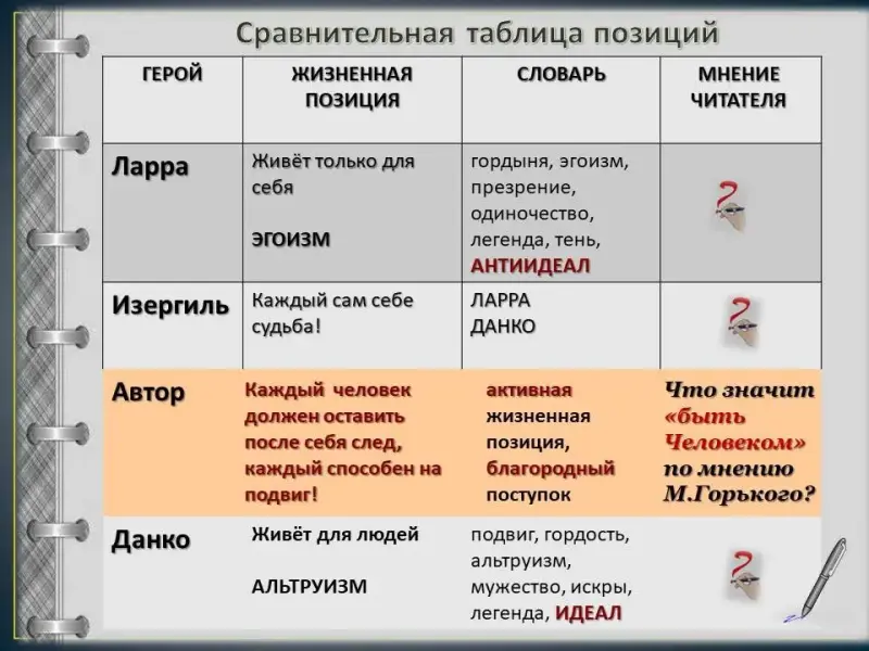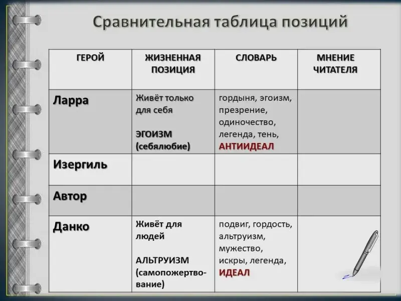 (18 слайд) Заполним таблицу позиций об Изергиль.