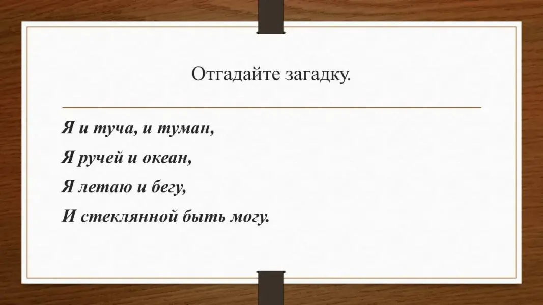 Учитель: Вода - существенная часть питания всего живого на Земле. Без воды трудно представить себе процессы пищеварения, процессы обмена веществ. С помощью воды осуществляется перенос питательных веществ по организму. Выполнив свои функции в организме, вода уносит из него всё ненужное и вредное. Каждая клеточка нашего тела содержит воду. Запас воды в организме должен постоянно пополняться. Без воды человек не проживёт и нескольких дней. Для поддержания жизнедеятельности человек использует большое количество воды. Она необходима для производства продуктов питания, и всего того, чем пользуется человек. Запасы пресной воды на Земле ограничены. Воду надо беречь. Не загрязнять её сточными водами, в состав которых входят отходы производства. Сброс или другие поступления в водные бассейны вредных веществ ухудшают качество поверхностных вод, ограничивают их использование, а также отрицательно влияют на состояние дна, береговых объектов, других соседствующих территорий.
