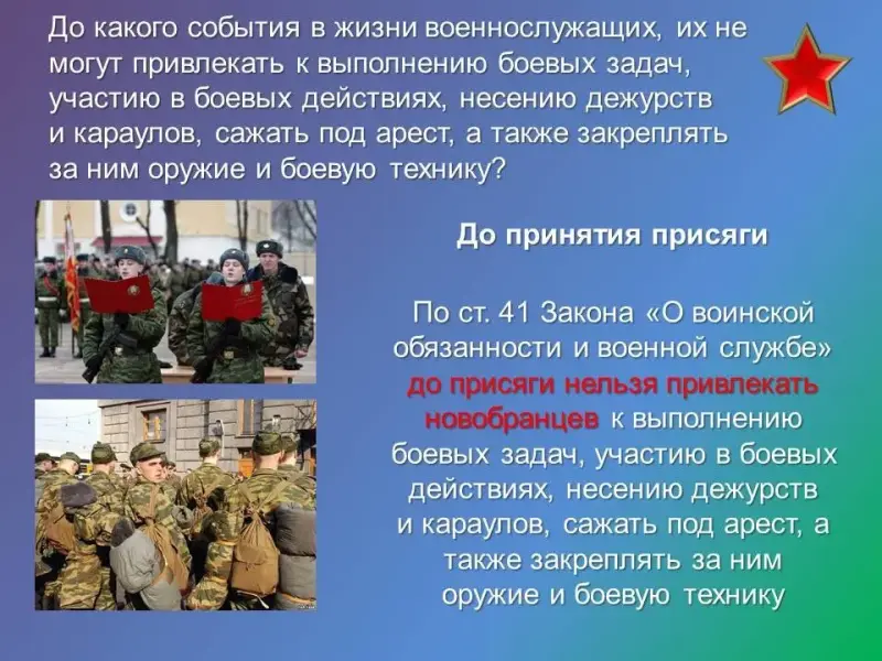 4. До какого события в жизни военнослужащих, их не могут привлекать к выполнению боевых задач, участию в боевых действиях, несению дежурств и караулов, сажать под арест, а также закреплять за ним