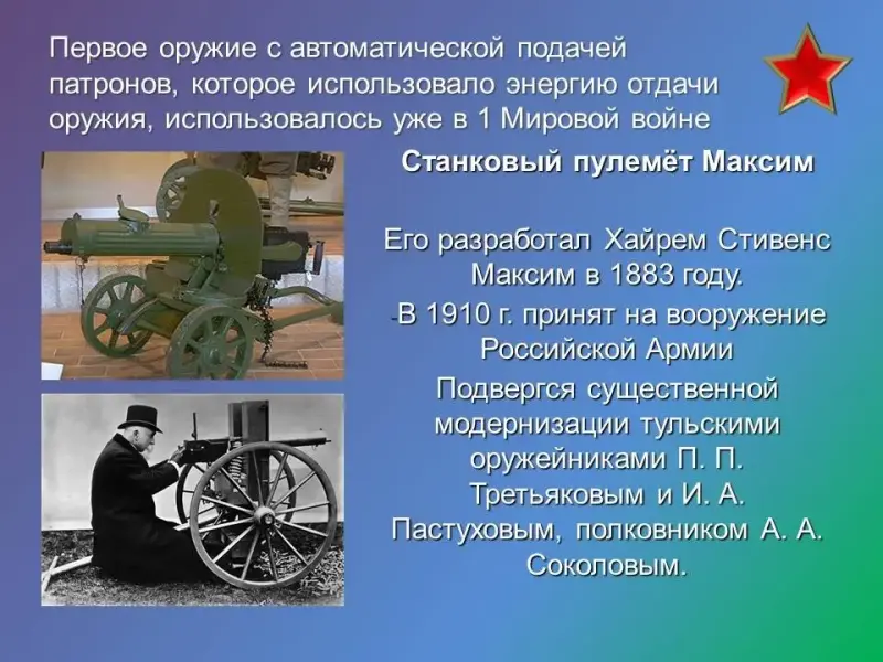 3. Первое автоматическое оружие, которое использовало энергию отдачи оружия, использовалось уже в Первой Мировой войне.