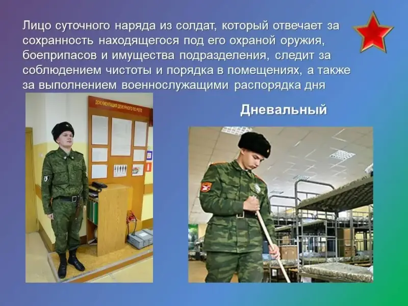 охраной оружия, боеприпасов и имущества подразделения и личных вещей солдат и сержантов, следит за соблюдением чистоты и порядка в помещениях, а также за выполнением военнослужащими распорядка дня,
