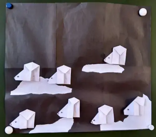 Дети складывают фигурки, приклеивают глаза и наклеивают на коллективную работу. Заранее сделана картина «Льдины в океане» (бумага черного цвета, на неё наклеены льдины - куски из белой бумаги).