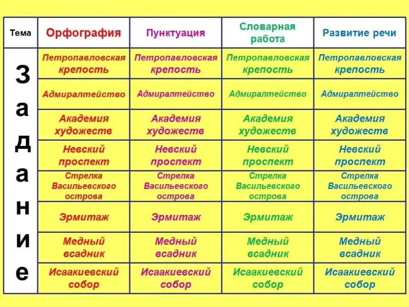 На уроках русского языка учащиеся имеют возможность выполнять отдельные задания по орфографии, пунктуации, развитию речи. Для этого на слайде №4 есть соответствующие кнопки. Нажимая на них можно выйти на любой слайд с заданием, выполнить его и снова вернуться на слайд с темами и объектами (слайд №4). Возвращение на слайд с темами (слайд №4) происходит нажатием на текст с заданием, на каждом слайде презентации. После выполнения задания выбранная кнопка задания исчезает.