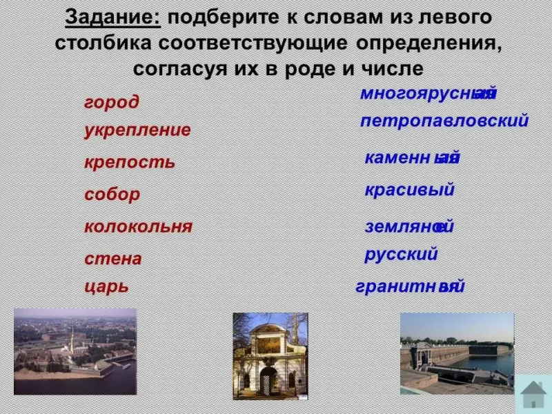 Задание: подберите к словам из левого столбика соответствующие определения, согласуя их в роде и числе.