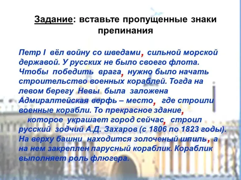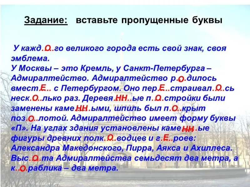 У Москвы - это Кремль, у Санкт-Петербурга - Адмиралтейство. Адмиралтейство р….дилось вмест….. с Петербургом. Оно пер…..страивал…..сь неск…..лько раз. Деревя…….ые п…..стройки были заменены каме……ыми, шпиль был п…..крыт поз…..лотой. Адмиралтейство имеет форму буквы «П». На углах здания установлены каме……е фигуры древних полк…..водцев и г…..роев: Александра Македонского, Пирра, Аякса и Ахиллеса. Выс…..та Адмиралтейства семьдесят два метра, а к…..раблика - два метра.