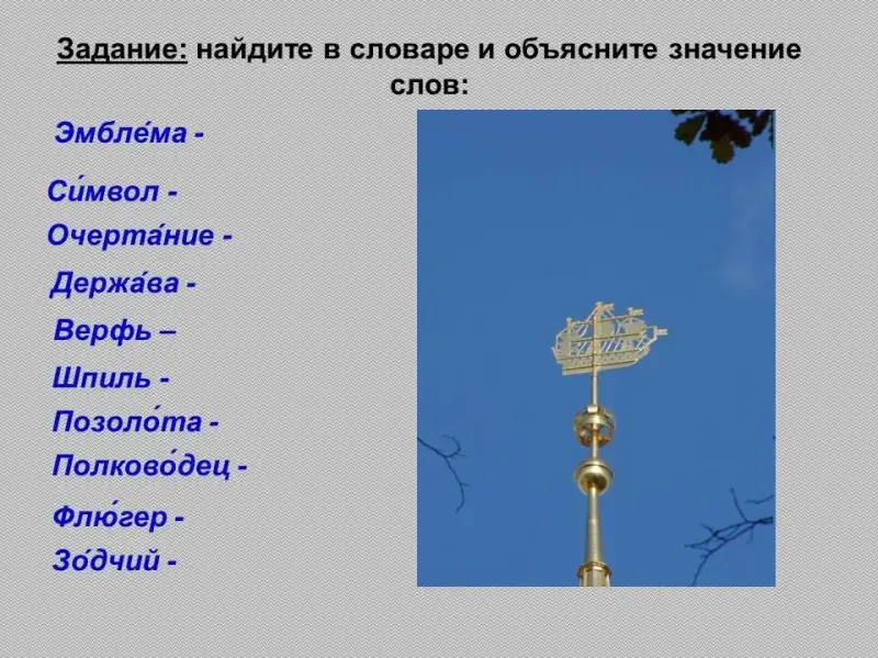 Эмблема, символ, очертания, держава, верфь, шпиль, позолота, полководец, флюгер, зодчий.