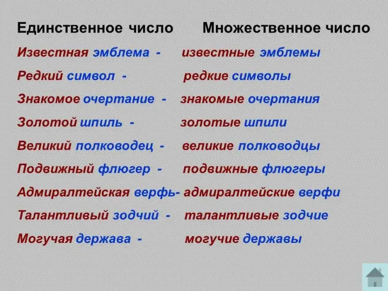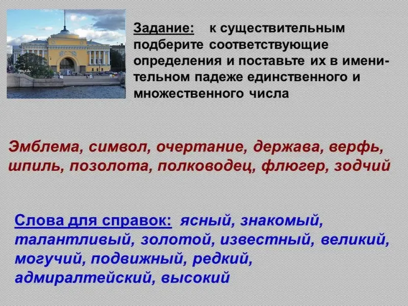 Задание: к существительным подберите соответствующие определения и поставьте их в именительном падеже единственного и множественного числа.