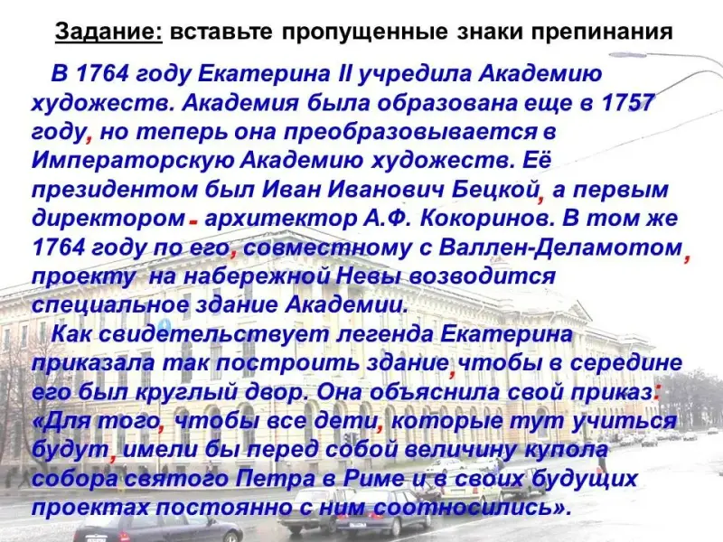 На Василь….вском острове, на наб….режной Невы, находится Академия худож….ств. Здание было построено в 1764 - 1789 годах по пр….екту архитекторов А.Ф.Кокоринова и Ж.Б. Валлен-Деламота. Фасад здания выходит к Неве. Первый этаж очень высокий с б….льшими ар….чными окнами. На втором этаже очень красивы б….льшие залы, соедине….ые вмест…. (анфилада залов). Они называются именами в….ликих итальянских художников. Рафаэлевский и Тициановский залы. В академии учились и преп….давали зам….чательные русские художники: В.И. Баженов, И.Н. Крамской, И.Е. Репин. В наст….ящ….е время здесь расп….лагается Институт жив….писи, скульптуры и архит….ктуры имени И.Е.Репина.