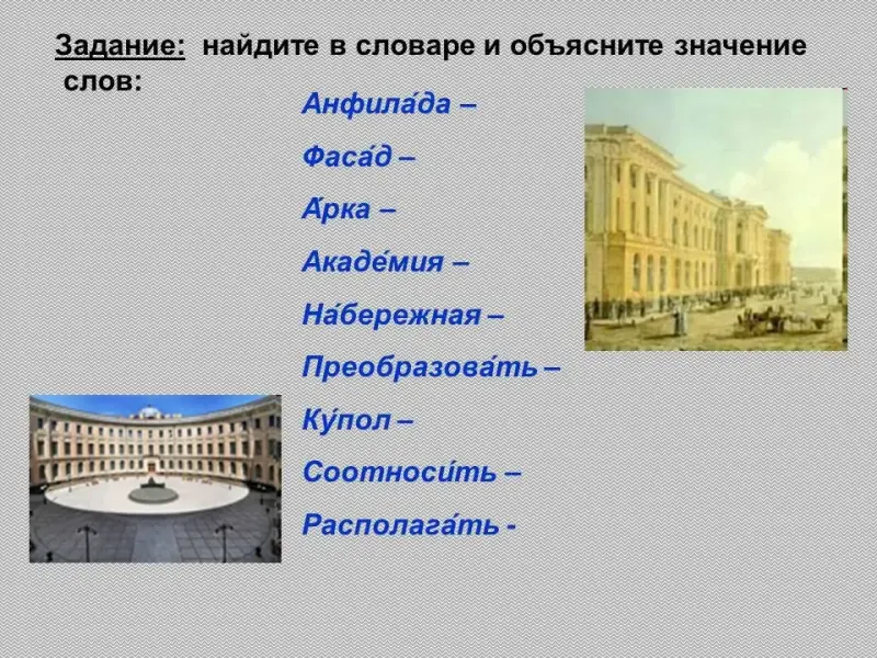 Анфилада, фасад, арка, академия, набережная, преобразовать, купол, соотносить, располагать.