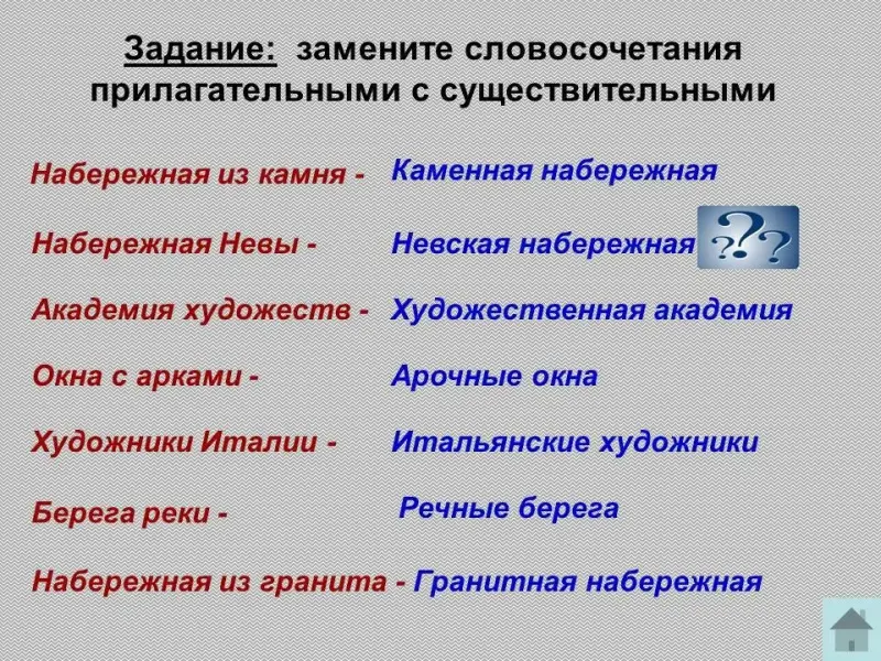 Задание: замените словосочетания прилагательными с существительными: