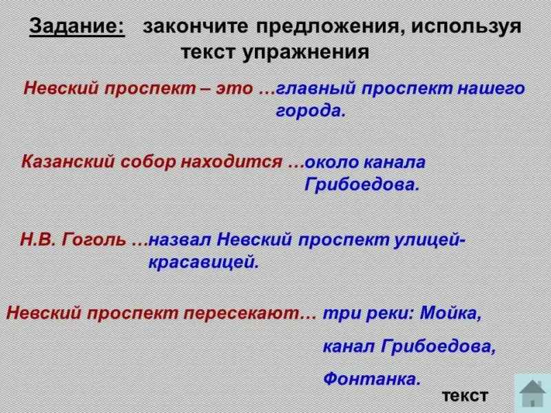 Задание: закончите предложения, используя тексты упражнений