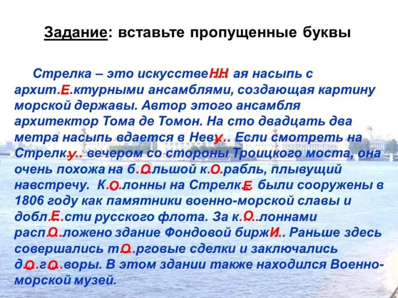 Стрелка - это искусстве…..ая насыпь с архит….ктурными ансамблями, создающая картину морской державы. Автор этого ансамбля архитектор Тома де Томон. На сто двадцать два метра насыпь вдается в Нев…. Если смотреть на Стрелк…. вечером со стороны Троицкого моста, она очень похожа на б….льшой к….рабль, плывущий навстречу. К….лонны на Стрелк… были сооружены в 1806 году как памятники военно-морской славы и добл….сти русского флота. За к…..лоннами расп….ложено здание Фондовой бирж…. Раньше здесь совершались т….рговые сделки и заключались д….г….воры. В этом здании также располагался Военно-морской музей.