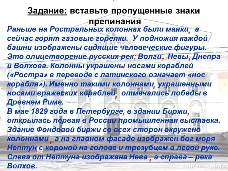 Раньше на Ростральных колоннах были маяки а сейчас горят газовые горелки. У подножия каждой башни изображены сидящие человеческие фигуры. Это олицетворение русских рек Волги Невы Днепра и Волхова. Колонны украшены носами кораблей («Ростра» в переводе с латинского означает «нос корабля»). Именно такими колоннами украшенными носами вражеских кораблей отмечались победы в Древнем Риме. В мае 1829 года в Петербурге в здании Биржи открылась первая в России промышленная выставка. Здание Фондовой биржи со всех сторон окружено колоннами а на главном фасаде изображен бог моря Нептун с короной на голове и трезубцем в левой руке. Слева от Нептуна изображена Нева а справа - река Волхов.