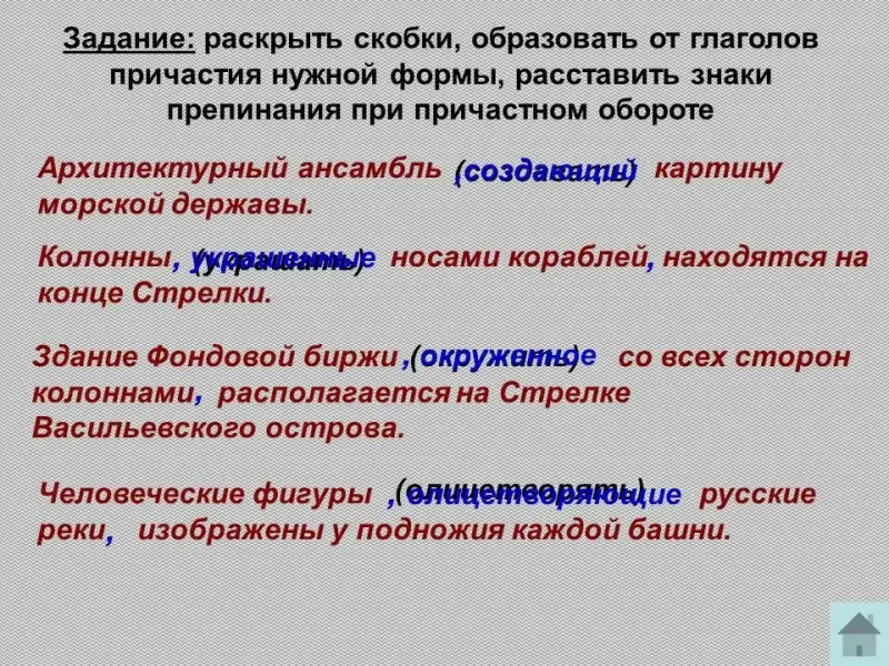 Задание: раскрыть скобки, образовать от глаголов причастия нужной формы, расставить знаки препинания при причастном обороте.