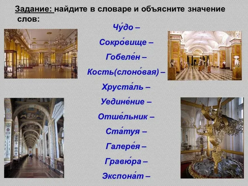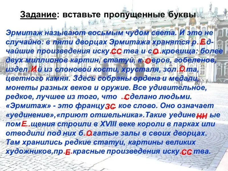 Эрмитаж называют восьмым чудом света. И это не случайно: в пяти дворцах Эрмитажа хранятся р….дчайшие произведения иску…..тва и с….кровища: более двух миллионов картин, статуй, к….вров, гобеленов, издел….й из слоновой кости, хрусталя, зол….та, цветного камня. Здесь собраны ордена и медали, монеты разных веков и оружие. Все удивительное, редкое, лучшее из того, что …..делано людьми. «Эрмитаж» - это францу…..кое слово. Оно означает «уединение», «приют отшельника».Такие уедине…..ые пом….щения строили в XVIII веке короли в парках или отводили под них б….гатые залы в своих дворцах. Там хранились редкие статуи, картины великих художников, пр….красные произведения иску…..тва.