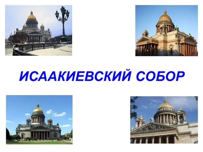 Там где сейчас возвышается Исаакиевский собор в 1710 году была построена первая деревянная церковь в честь русского царя Петра I. Стены собора украшают различные сорта русского и итальянского гранита мозаичные и живописные произведения авторами которых являются знаменитые художники Брюллов Бруни Басин и другие. Высота Исаакиевского собора - 101,5 метра длина - 111,2 метра а вес 300000 тонн. Купол собора покрытый золотом виден за 20-30 километров от Петербурга.