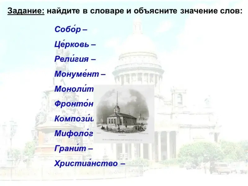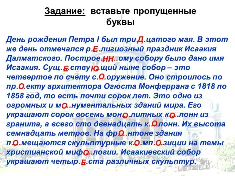 День рождения Петра I был три….цатого мая. В этот же день отмечался р….лигиозный праздник Исаакия Далматского. Построе…….ому собору было дано имя Исаакия. Сущ….ству….щий ныне собор - это четвертое по счету с….оружение. Оно строилось по пр….екту архитектора Огюста Монферрана с 1818 по 1858 год, то есть почти сорок лет. Это одно из огромных и м….нументальных зданий мира. Его украшают сорок восемь мон....литных к….лонн из гранита, а всего сто двенадцать к….лонн. Их высота семнадцать метров. На фр….нтоне здания п….мещаются скульптурные к….мп….зиции на темы христианской миф….логии. Исаакиевский собор украшают четыр….ста различных скульптур.