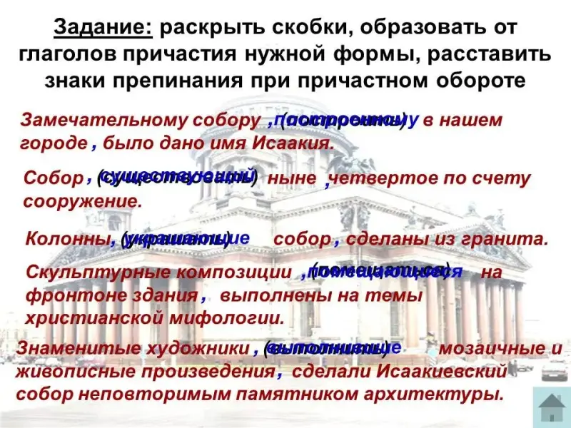 Замечательному собору (построить) в нашем городе было дано имя Исаакия.