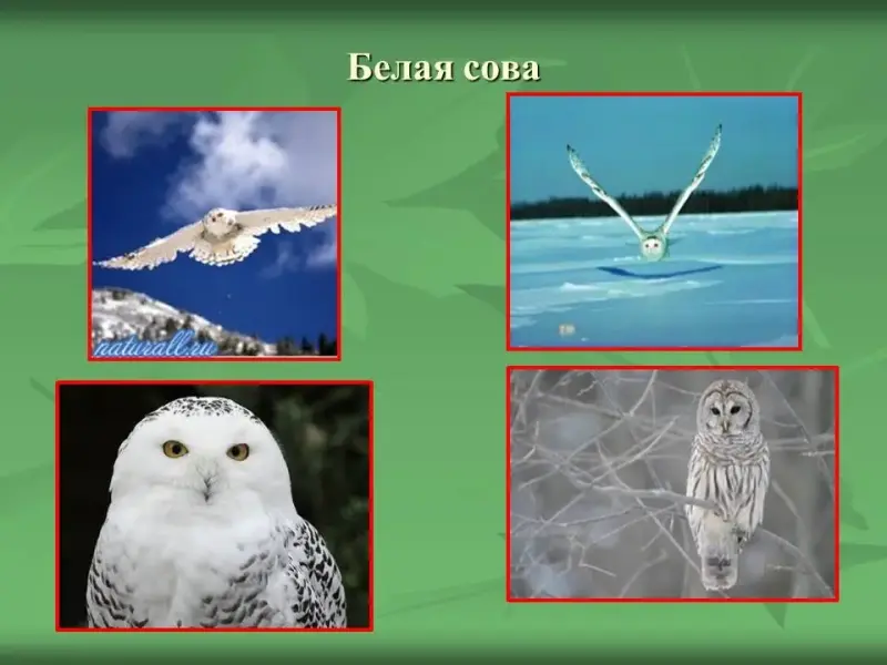 Сова - птица семейства совиных. Самцы обычно чисто-белые, с отдельными темными отметинами, а самки белые только снизу, сверху исчерчены темными поперечными полосками. Глаза большие, желтые; клюв и когти черные. Лицевые перья прикрывают клюв, предохраняя его от охлаждения. В целом оперение рыхлое, задерживающее много воздуха, который уменьшает потерю тепла. На крыльях перья жесткие, однако, полет у сов бесшумный. Пальцы настолько укрыты длинными перьями, что когти погружаются в них почти полностью. Все это помогает совам переносить суровые морозы.