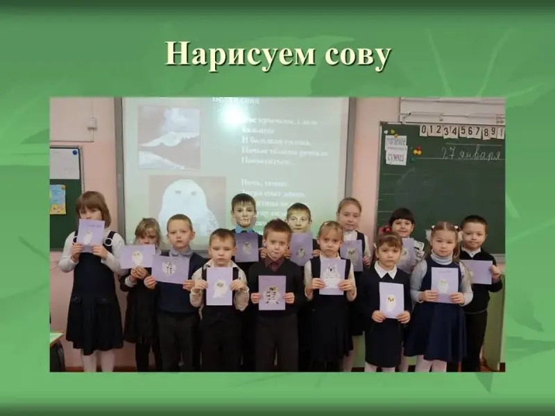 Оборудование: презентация «Большемуртинский заказник. Белая сова», книга В.Бианки с рассказом «Сова», инструменты для рисования, презентация «Как нарисовать сову?»