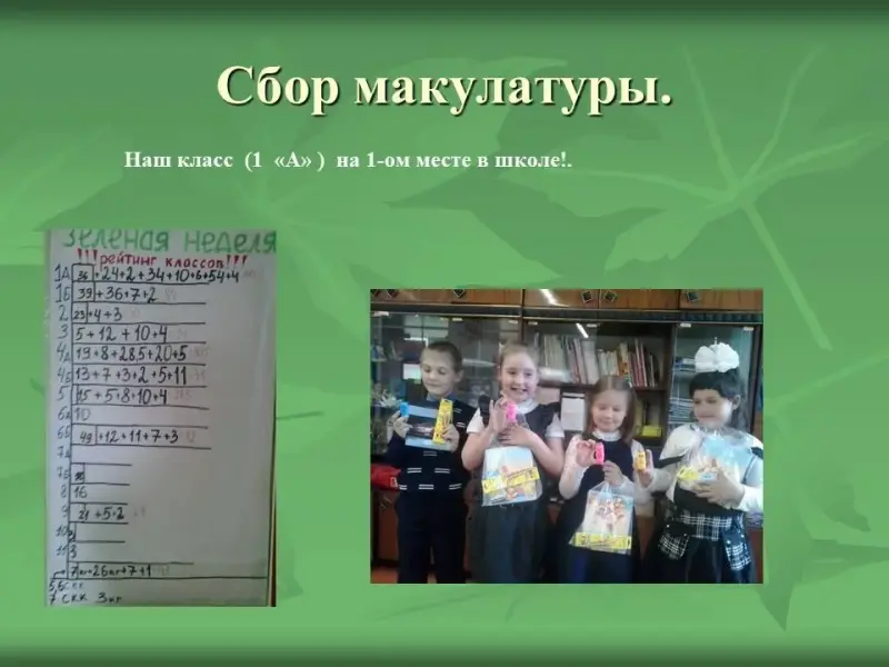 - Ребята, а вы знаете, что сбор макулатуры сохраняет лес? 60 кг макулатуры спасает жизнь одной ели. Мы с вами собрали макулатуры больше всех в школе и заняли 1-е место. Мы собрали 170 кг макулатуры! И сегодня я хочу наградить подарками самых активных детей и их родителей. (Награждение родителей грамотами, детей - подарками). Эту работу мы продолжим и в следующем учебном году.