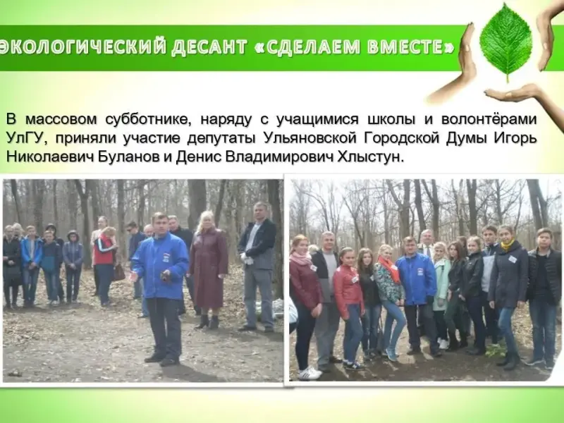 В наших стремлениях и участии в экологической акции «Сделаем вместе!» нас поддержал депутат Ульяновской Городской Думы Денис Владимирович Хлыстун. Он встретился с учениками школы и провёл беседу, в которой рассказал об экологических проблемах, важности сохранении природы и направил ребят на дальнейшее правильное поведение и отношение к окружающей среде.
