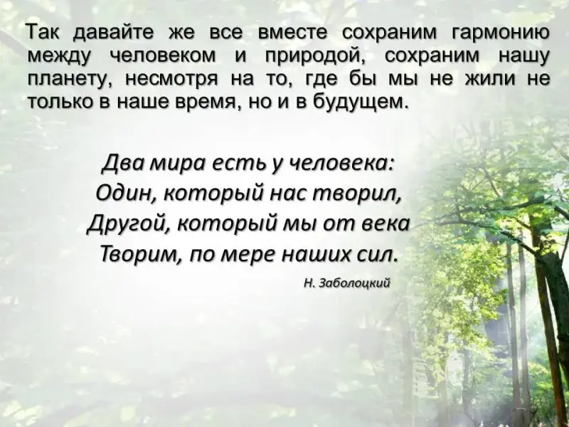 Все вместе мы обязательно сохраним гармонию между человеком и природой, сохраним нашу планету, несмотря на то, где бы мы ни жили не только в наше время, но и для будущих поколений.
