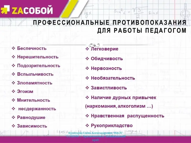 СЛАЙД № 7 Профессиональные противопоказания для работы педагогом (список, составленный с учетом мнения ученых, педагогов, студентов, литературных источников, рассказывающих о педагогах)