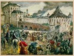 Ведущий: Но бывали в истории России и такие времена, когда теряли люди веру и разум, не могли отличить добро от зла, правду ото лжи: вражда и взаимные обиды застилали людям глаза. Было такое время на Руси и чуть больше четырёхсот лет назад. Тот период историки и летописцы называют «Смутное время». |