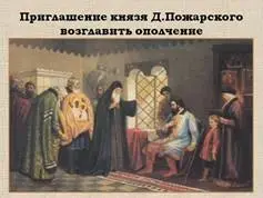 Ведущий: Услышали его призыв в Нижнем Новгороде. Купец Козьма Минин первым отдал на ополчение (так называли народное войско) всё своё богатство. Козьма обратился с призывом к жителям города. Собрали нижегородцы большое войско. Во главе его встал князь Дмитрий Пожарский. Двинулось ополчение к Москве. И в пути росло не по дням, а по часам. Люди стекались отовсюду. |