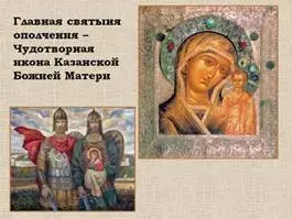 Страница 4. «Подвиг народа» Ведущий: Главной святыней ополчения стала Чудотворная икона Казанской Божией Матери, перенесённая специально в Нижний Новгород из Казани. Войско двинулось к Москве. Во главе войска несли Икону. К концу лета ополченцы подошли к столице, заняли Земляной и Белый город. |