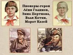 Ведущий: Всем известны подвиги партизанских отрядов в Беларусии, Украине, Ленинградской, Псковской и других захваченных областях. В захваченных фашистами городах действовали не только взрослые подпольные ячейки, но и детские. Молодогвардейцы из города Краснодона за свою деятельность заплатили собственной жизнью. Известен подвиг пионеров-героев. Вот их имена: Леня Голиков, Зина Портнова, Валя Котик, Марат Казей. |