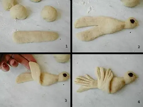 Воспитатель показывает приёмы лепки: из куска теста раскатываем шарик, шарик раскатываем в жгут (колбаску). На одном конце делаем надрез для хвоста и крыла. Из другого вытягиваем клюв, берём горошинки, чечевицу или изюм - вот и глаза.