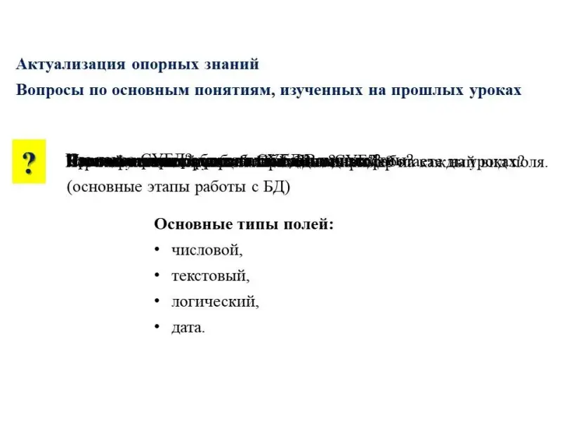 понятий запись и поле в базе данных, типов полей. Учащиеся отвечают на вопросы учителя