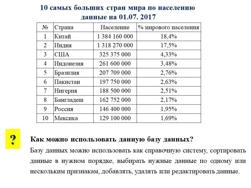 (слайд 3) Учитель предлагает пример базы данных «10 самых больших стран мира по населению» и предлагает учащимся найти варианты ее использования, тем самым определяется тема и цель урока.