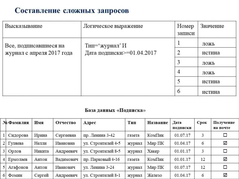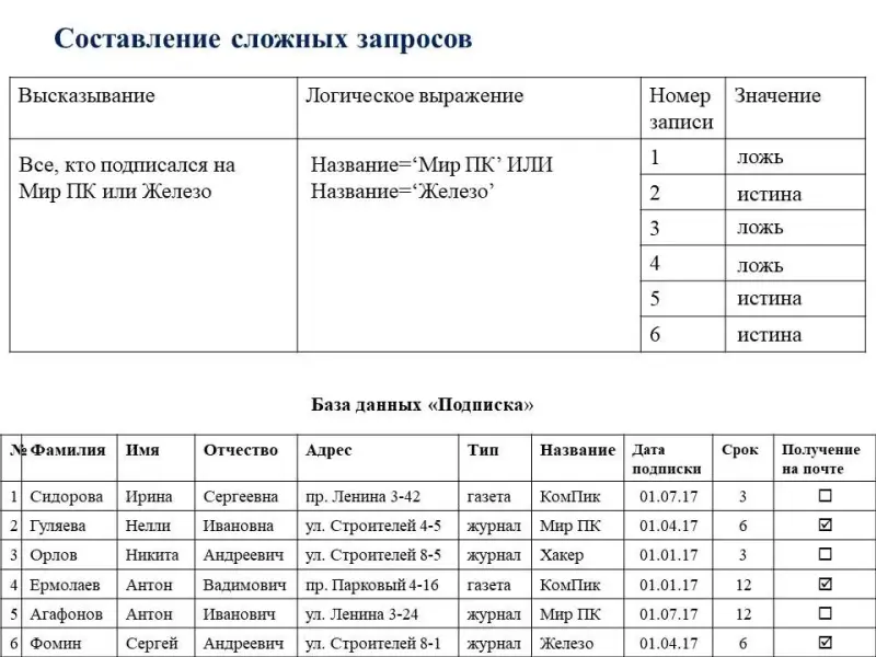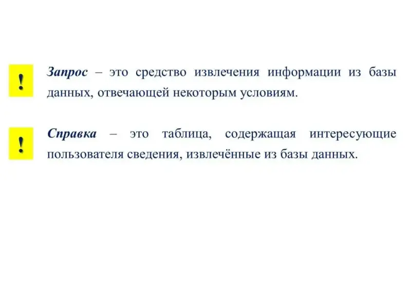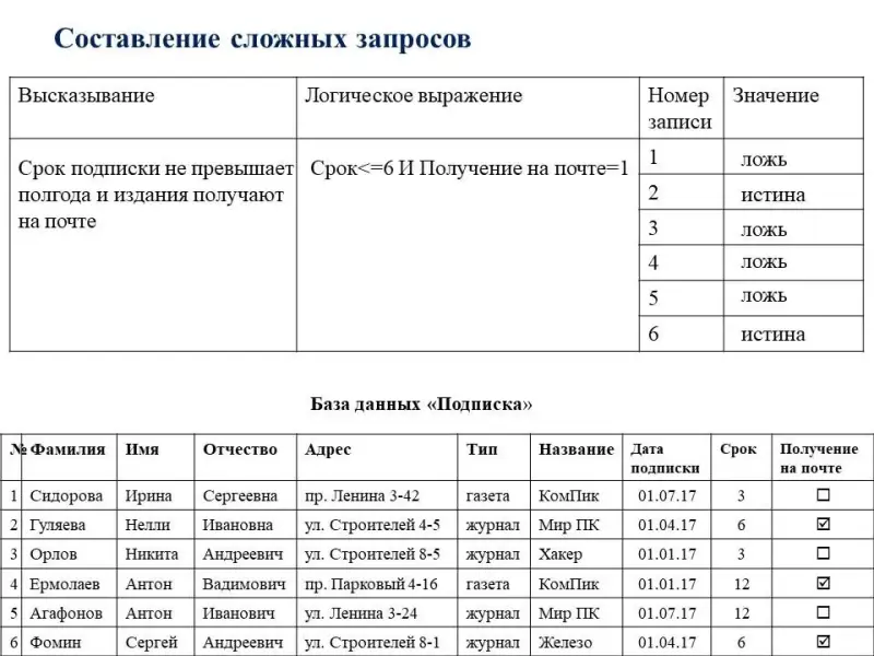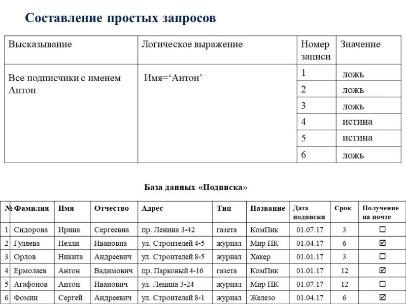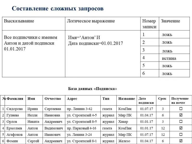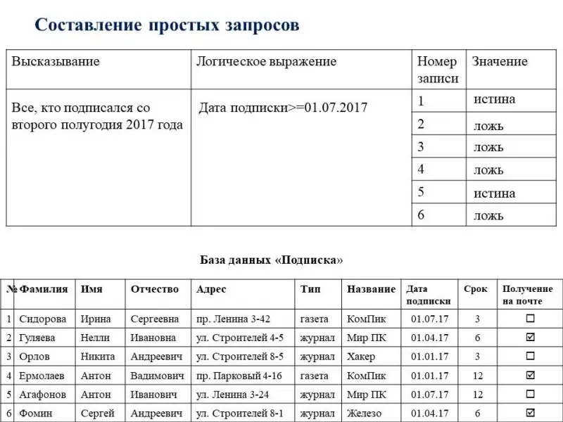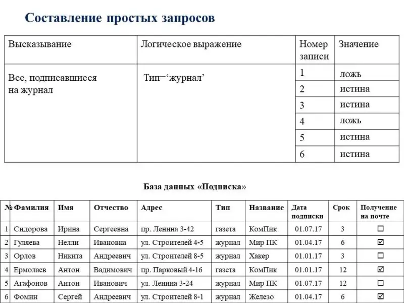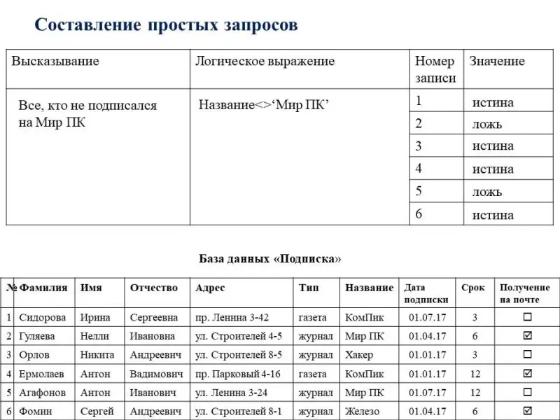 Цель урока: познакомить учащихся с основными понятиями «запрос», «простое логическое выражение», «сложное логическое выражение» и показать практическое применение запросов, научить создавать запросы в базе данных, осуществлять сортировку данных в таблице.