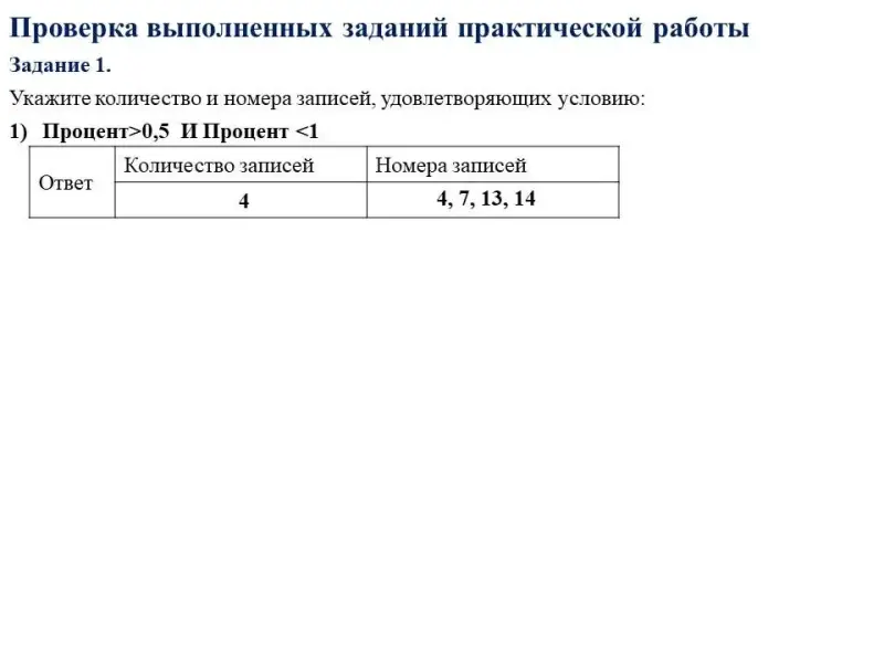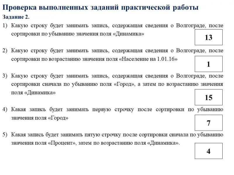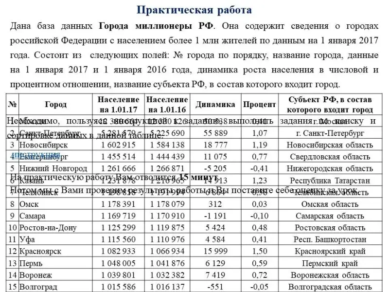 Необходимо, пользуясь инструкцией к заданию, выполнить задания по поиску и сортировке данных в данной таблице. На практическую работу отводится 15 минут. После выполнения работы, проводится