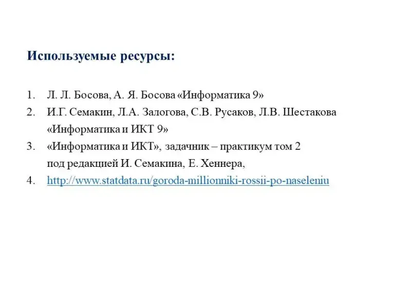 - И.Г. Семакин, Л.А. Залогова, С.В. Русаков, Л.В. Шестакова «Информатика и ИКТ 9».