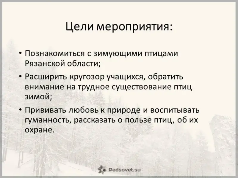 - Расширить кругозор учащихся, обратить внимание на трудное существование птиц зимой;