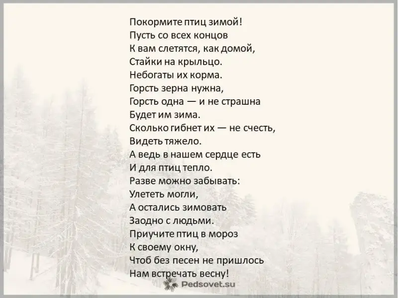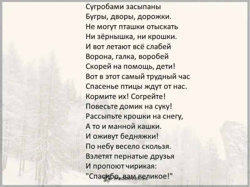 Пришла зима. Многие птицы улетели на юг. А мы: воробьи, синицы - остались с вами в городе. Голодно нам. А еда под снегом. Не удивляйтесь, что мы еще с осени начинаем носами в окна стучать. Мы напоминаем вам: вы слушали весной наши песни, осенью ели груши, яблоки. Это мы сады охраняли. Теперь ваш черед. Помогите нам!