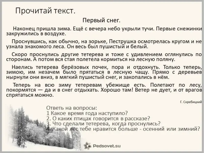 Слайд 3 (Прочитать текст «Снегирь» и ответить на вопросы по тексту)