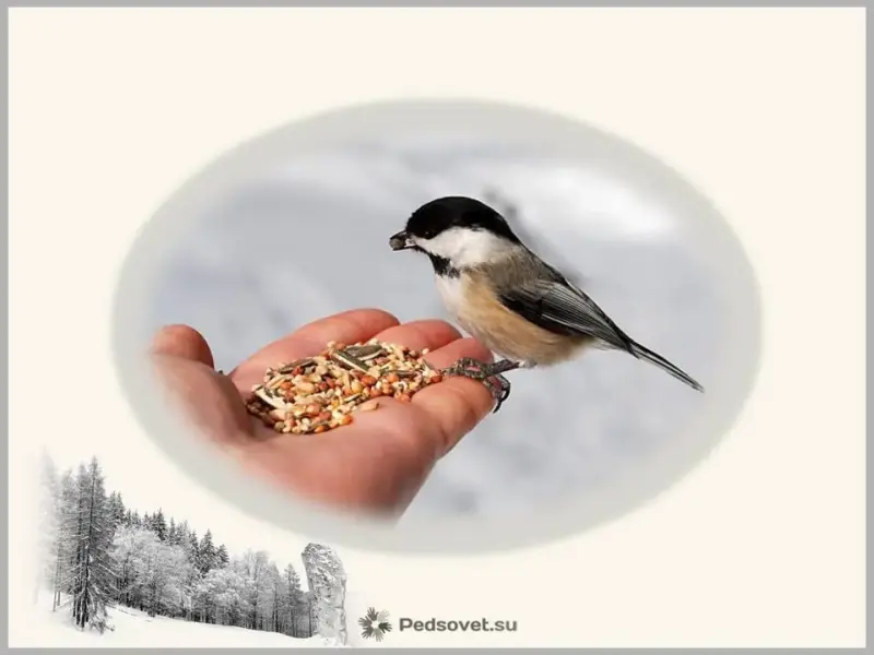 Учитель: Если вы начали подкармливать птиц, продолжайте делать это до конца зимнего сезона. Зёрна, семечки и орехи следует подсыпать регулярно, иначе, обнаружив несколько раз кормушку пустой, птицы улетят в другое место. Зимняя столовая будет работать и весной, пока не появится первая зелень.