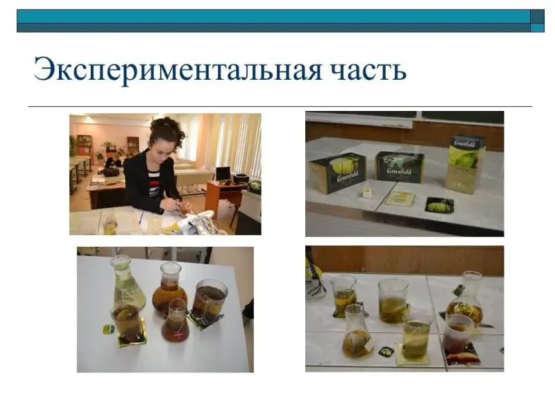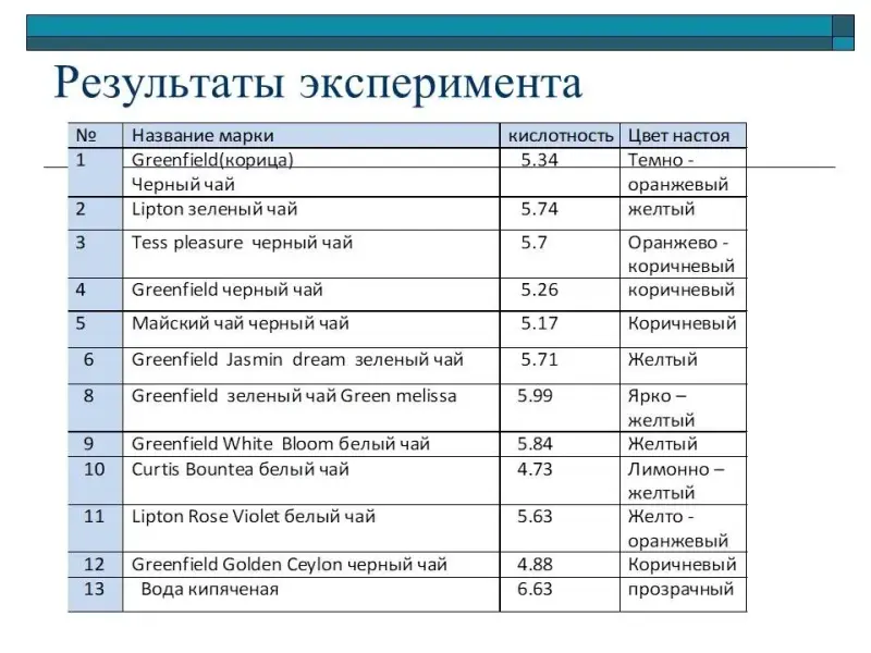 - Эксперимент показал, что настой черного чая имеет более темную и насыщенную окраску, а зеленого и белого более светлую.