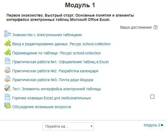 Плюсом дистанционной системы подачи знаний предложенного курса является то, что обучающийся может в любой момент вернуться к теоретическому материалу и восполнить пробелы в знаниях, если что-то забыл. Дистанционный курс - это «учебник, который невозможно потерять или испортить». Преподаватель может построить занятия таким образом, чтобы охватить только часть курса, необходимую для знакомства с основными возможностями программы Microsoft Excel на базовом уровне или расширить представление обучающихся об использовании электронных таблиц темами: