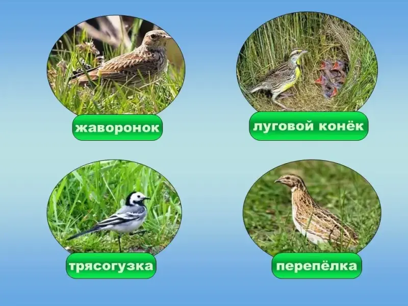 Познакомьтесь с птицами, которых можно встретить на лугу. Птицы гнездятся и питаются на земле. Почему птицы строят гнёзда на земле?