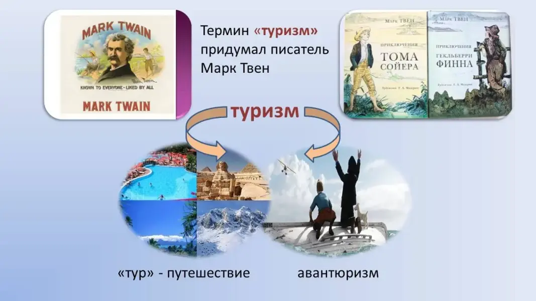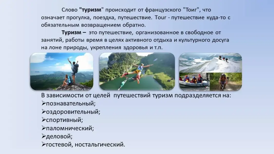 Слово "туризм" происходит от французского "Тоиг", что означает прогулка, поездка, путешествие. Тour - путешествие куда-то с обязательным возвращением обратно.