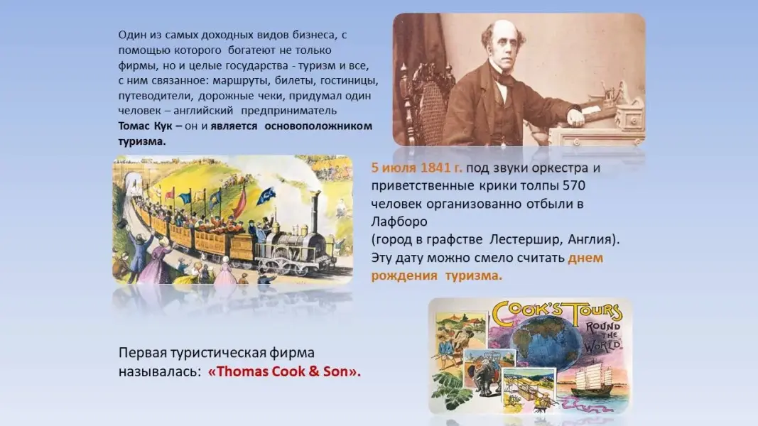 Один из самых доходных видов бизнеса, с помощью которого богатеют не только фирмы, но и целые государства - туризм и все, с ним связанное: маршруты, билеты, гостиницы, путеводители, дорожные чеки, придумал один человек - английский предприниматель Томас Кук - он и является основоположником туризма.
