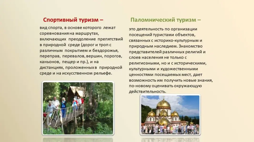 Паломнический туризм - это деятельность по организации посещений туристами объектов, связанных с историко-культурным и природным наследием. Знакомство представителей различных религий и слоев населения не только с религиозными, но и с историческими, культурными и художественными ценностями посещаемых мест, дает возможность им получить новые знания, по-новому оценивать окружающую действительность.