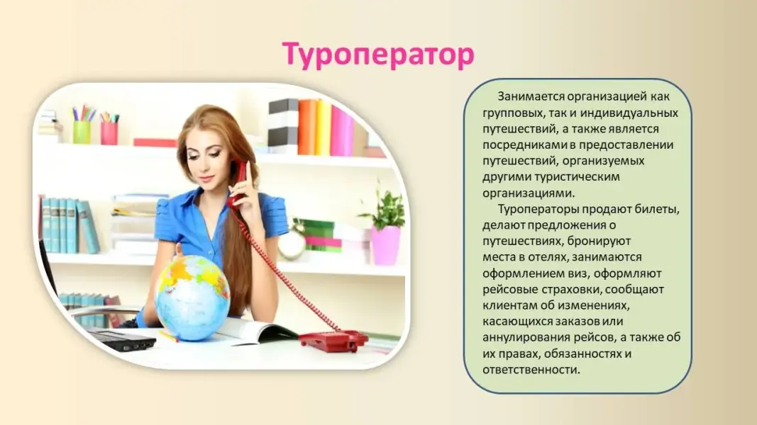 Туроператор - занимается организацией как групповых, так и индивидуальных путешествий, а также является посредниками в предоставлении путешествий, организуемых другими туристическим организациями. Туроператоры продают билеты, делают предложения о путешествиях, бронируют места в отелях, занимаются оформлением виз, оформляют рейсовые страховки, сообщают клиентам об изменениях, касающихся заказов или аннулирования рейсов, а также об их правах, обязанностях и ответственности.
